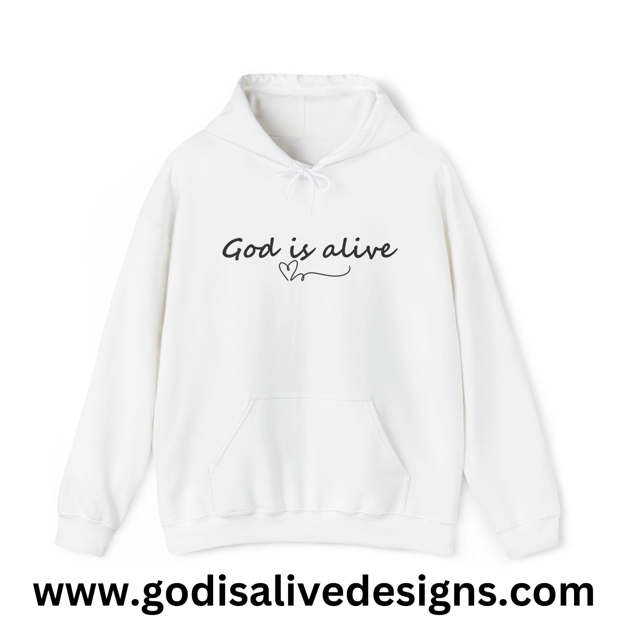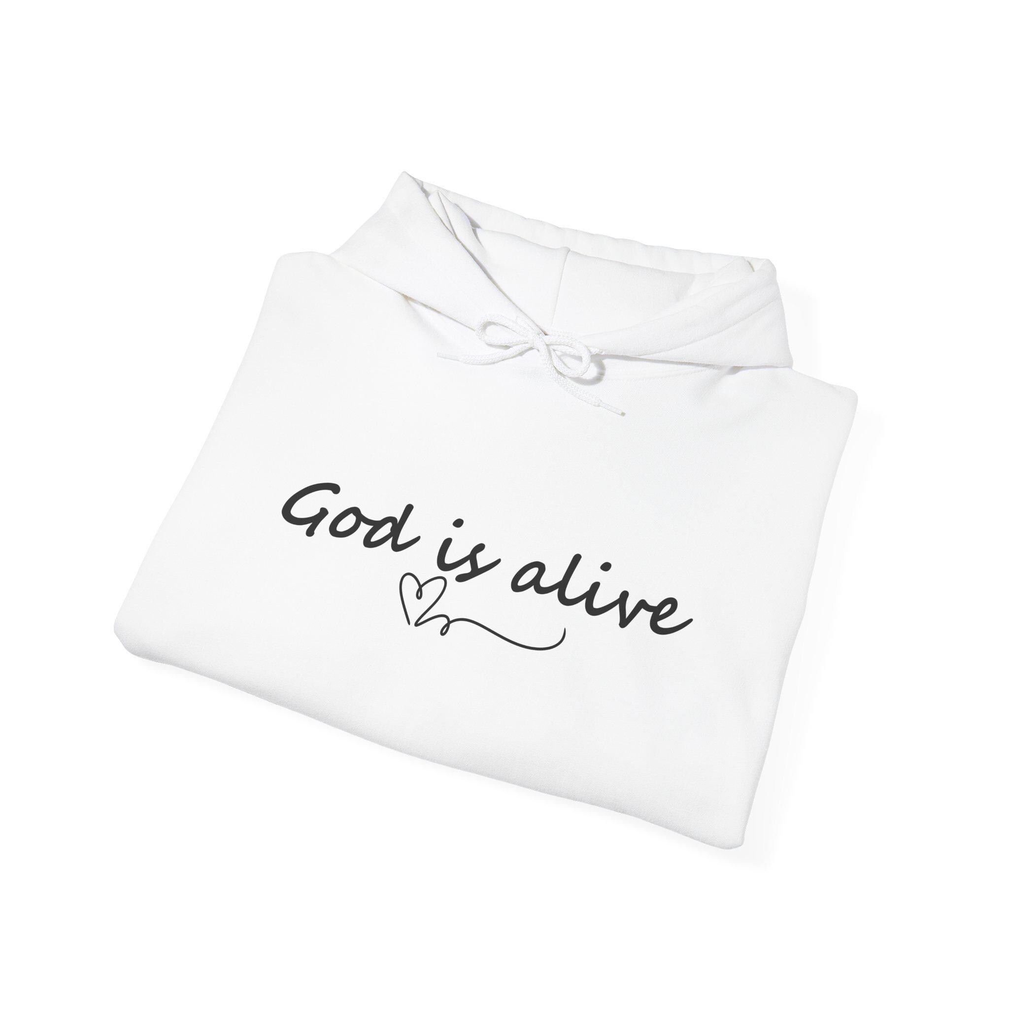 This Unisex Heavy Blend™ Hooded Sweatshirt features a powerful design with the message 'god is alive'. It exudes a spiritual and uplifting vibe, perfect for those who seek to express their faith and beliefs through their clothing. This hoodie is ideal for those who appreciate comfortable, cozy apparel with a touch of inspiration. It is relevant for religious holidays, spiritual observances, or everyday wear for individuals who want to make a statement.
